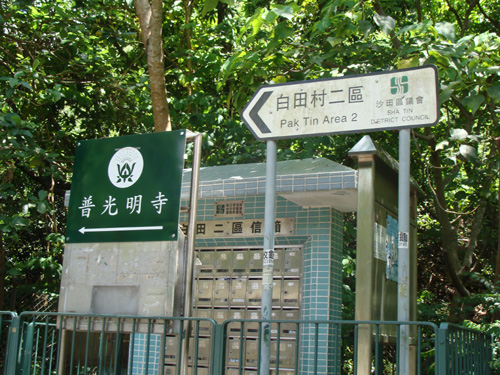 The entrance is near Pak Tin (白田村). This sign marks the starting point of this journey. By following the sign, you will soon come a temple. Although you may find some ribbons leading you to go inside the temple area, you don't have to. You can just follow the concrete path outside the temple.
