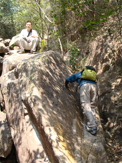 Here is the last challlenge. You can see the dry waterfall blocking your way. To overcome this, we can either climb on the right or left. There are ribbons on both sides. Actually we tried both. The guy in the picture is making attempt on the left. It works but you have to handle a sandy slope on top of a cliff. On the right, the "route" is very bushy and we have to take zigzag route to overcome some rocks. Comparatively, the left route seems a little bit more approachable. Anyway, both ways are not for the fainthearted.
