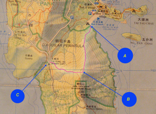 This route is very accessible. From A to B, there is no official route on government map. Even so, the hiking path is quite easy to follow. It is very windy if there is easterly wind. At B, you will find a junction. Taking the right turn, you will eventually go to Tai Fung Au (大風凹) (location C) where you can take public transportation. If you go straight from point B, you will reach Hok Tsui Shan (鶴咀山) wireless station which is a restricted area. Getting into restricted area may be subjected to prosectuation.